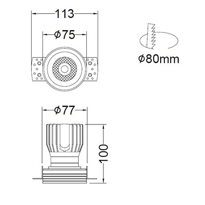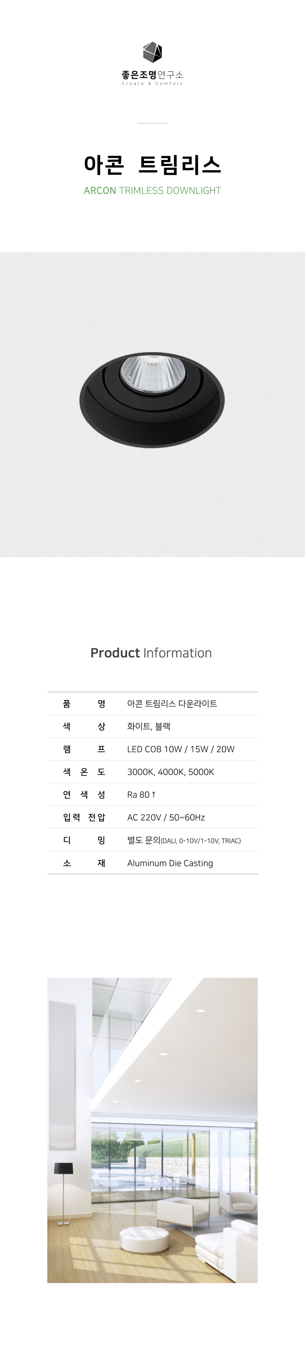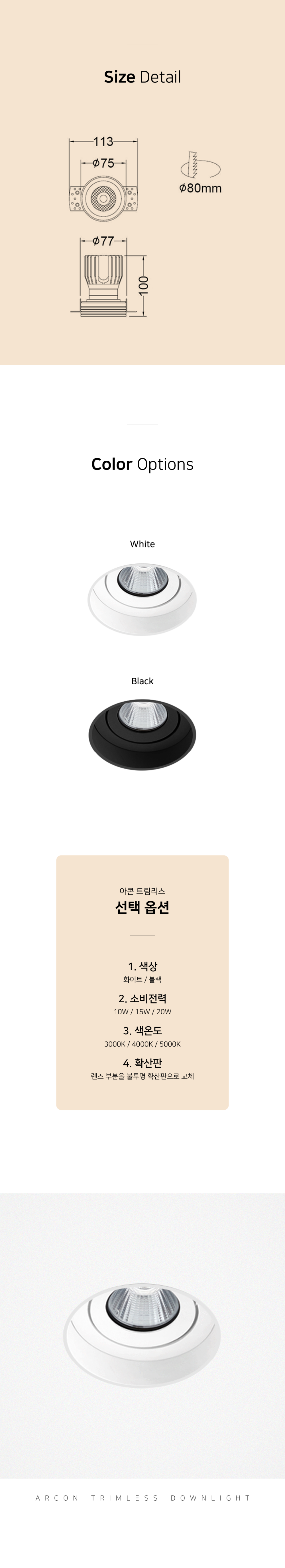 컬러, 확산판, 소비전력 선택 옵션이 있는 트림리스 다운라이트
