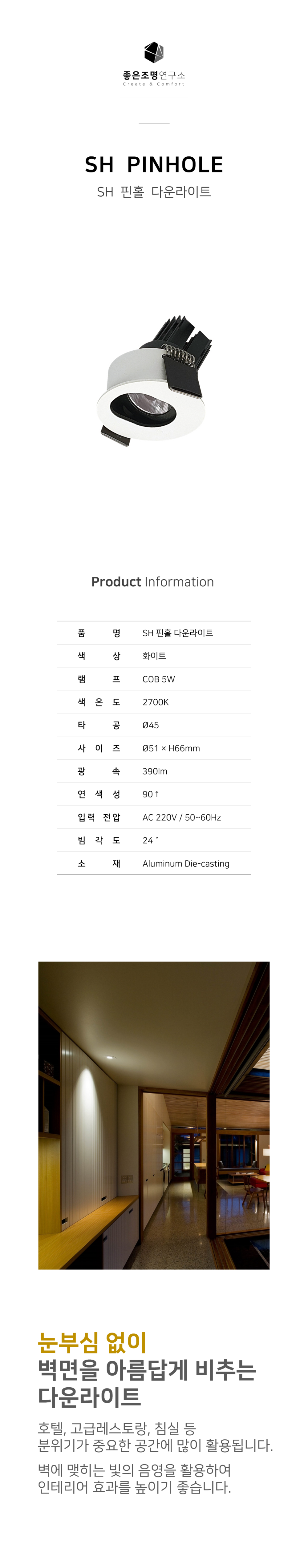 눈부심 없이 벽을 아름답게 비추는 다운라이트